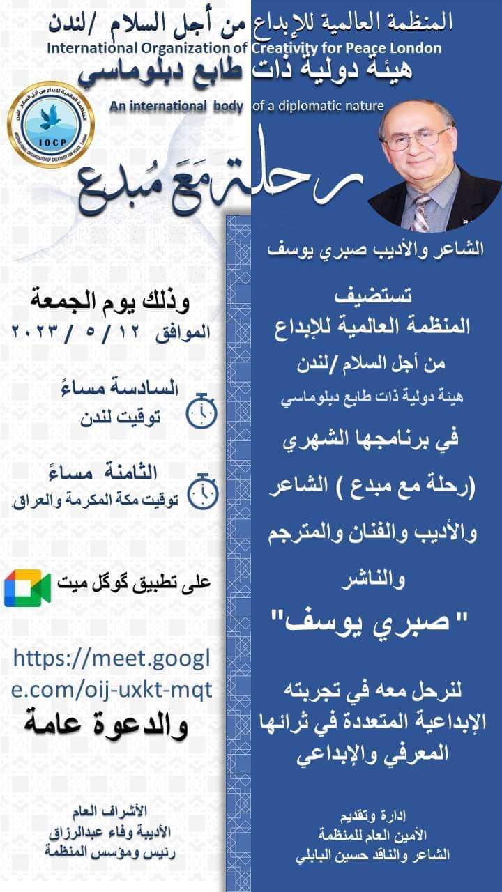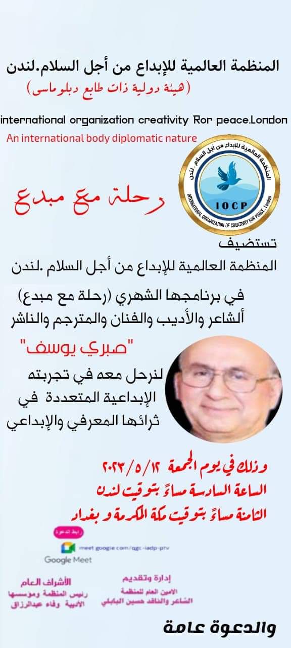 تستضيف المنظمة العالمية للإبداع من أجل السلام/ لندن في برنامجها الشهري (رحلة مع مبدع) الشاعر والأديب والفنان والمترجم والناشر " صبري يوسف"لنرحل معه في تجربته الإبداعية المتعددة في ثرائها المعرفي والإبداعي وذلك يوم الجمعة الموافق ١٢/ ٥/ ٢٠٢٣ السادسة مساءً توقيت لندن ،الثامنة مساءً توقيت مكة المكرمة