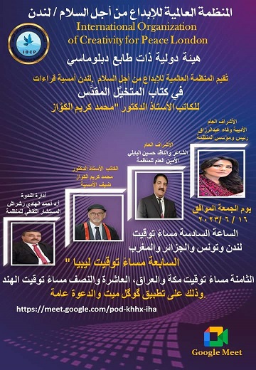 تُقيم المنظمة العالمية للإبداع من أجل السلام- لندن أمسية قراءات في كتاب (المتخيَّل المقدَّس) للكاتب الأستاذ الدكتور "محمد كريم الكوَّاز" يوم الجمعة الموافق 16-6-2023 في تمام الساعة السادسة مساءً بتوقيت لندن وتونس والجزائر والمغرب، السابعة مساءً بتوقيت ليبيا، الثامنة مساءً بتوقيت مكة والعراق، العاشرة والنصف مساءً بتوقيت الهند.