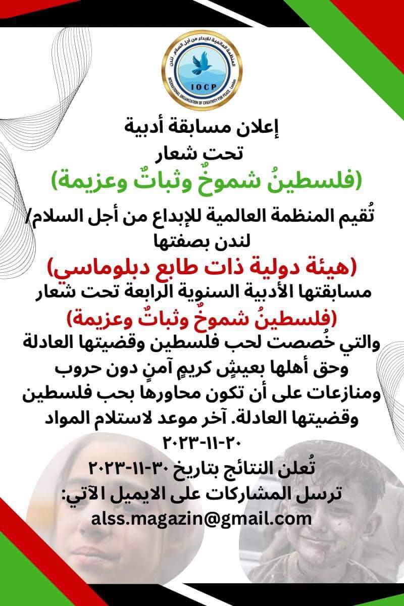 إعلان مسابقة أدبية تحت شعار ( فلسطينُ شموخٌ وثباتٌ وعزيمة) تُقيم المنظمة العالمية للإبداع من أجل السلام/لندن بصفتها( هيئة دولية ذات طابع دبلوماRead More