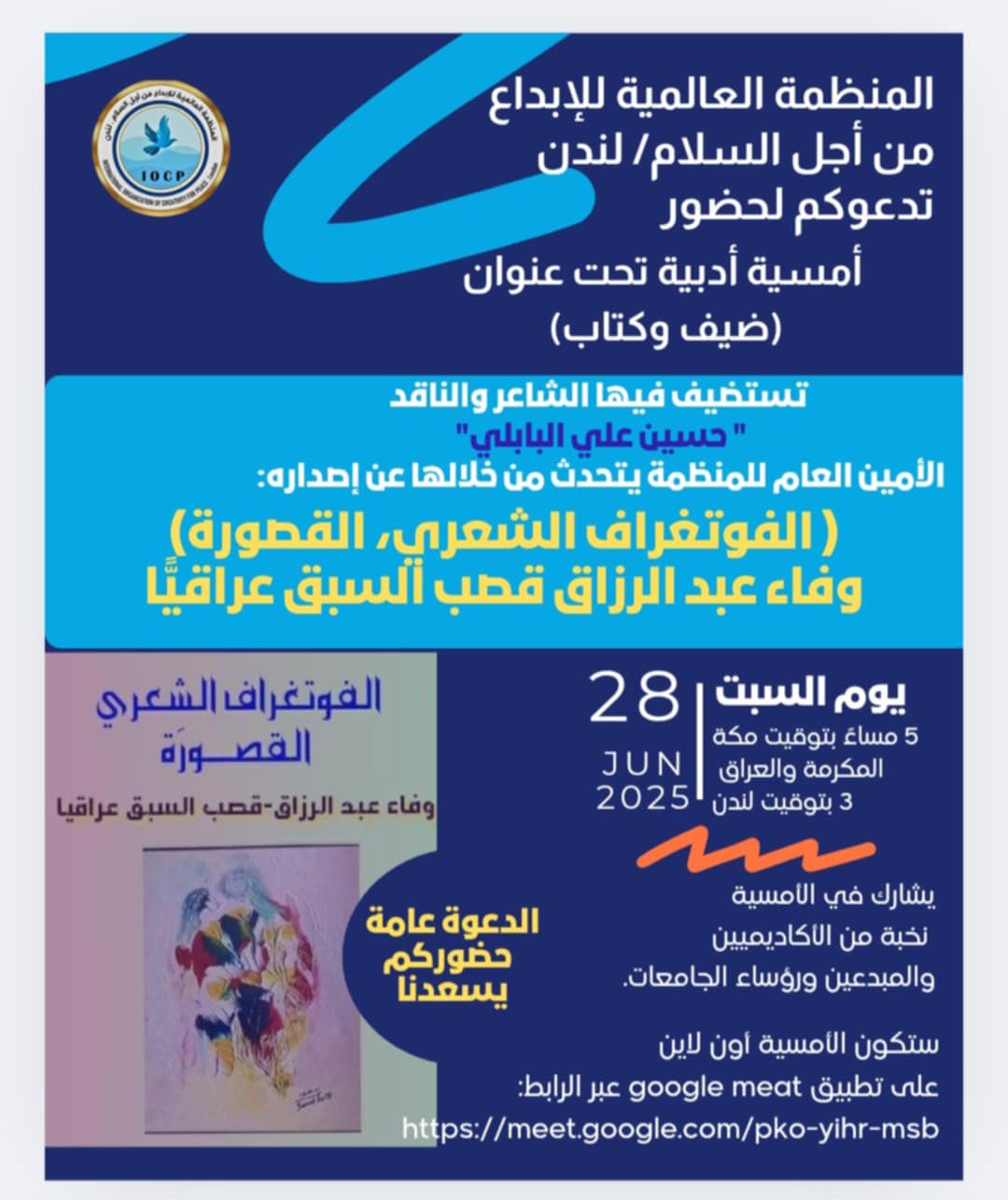 إعلان تقيم المنظمة العالمية للإبداع من أجل السلام/ لندن، أمسية تحت عنوان( ضيف وكتاب) تستضيف فيها الشاعر والناقد" حسين علي البابلي" الأمين العام للمنظRead More