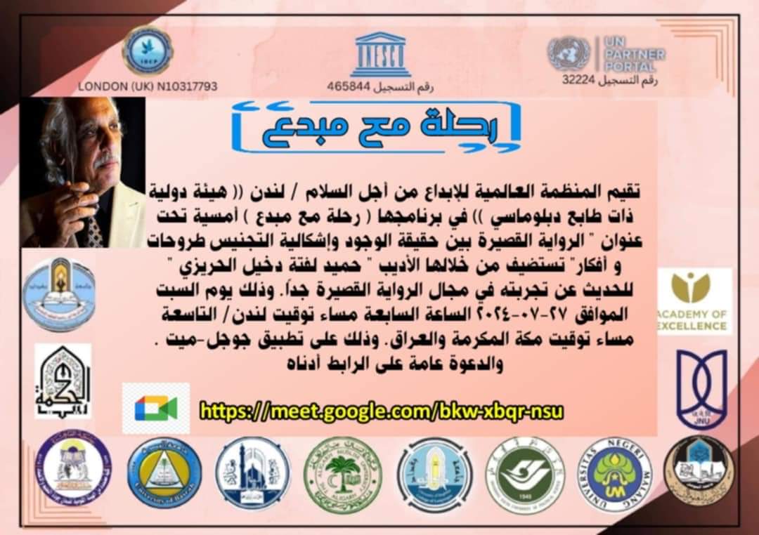 دعوة عامة لمحبي الإبداع رحلة مع مبدع تُقيم المنظمة العالمية للإبداع من أجل السَّلام/ لندن( هيئة دولية ذات طابع دبلوماسي) في برنامجها ( رحلة مع مبدع ) أمسية تحت عنواRead More