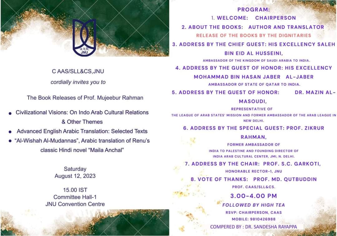 نبارك لسعادة البروفيسور "مجيب الرحمن" المستشار الأكاديمي للمنظمة العالمية للابداع من أجل السلام/ لندن ورئيس مكاتبها في الهند حفل تدشين كتابية (الترجمة الانجليزية العربية المتقدمة،نصوص مختارة )و كتاب(رؤى حضارية في العلاقات الثقافية العربية الهندية، ومواضيع أخرى) في حفل كبير بحضور السفراء العرب والأساتذة والباحثين.