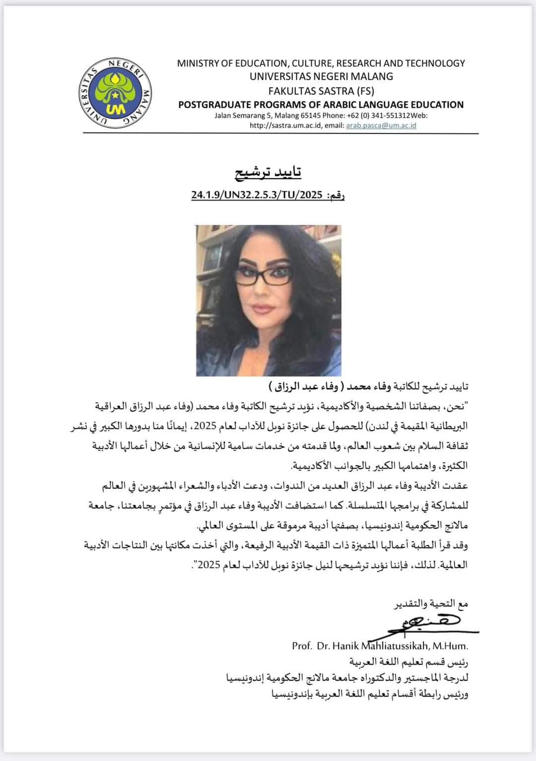 ٤- سعادة البروفيسور” هنيء محيلة الصحة" رئيس قسم اللغة العربية لطلبة الدكتوراه والماجستير( جامع مالانج الحكومية) إندنوسيا، ورئيس رابطة أقسام تعليم اللغة العربية، إندنوسيا.