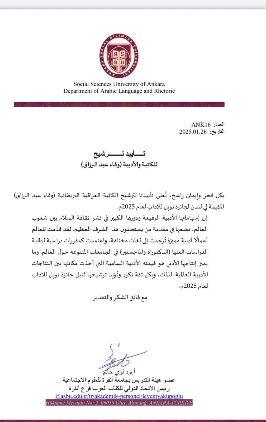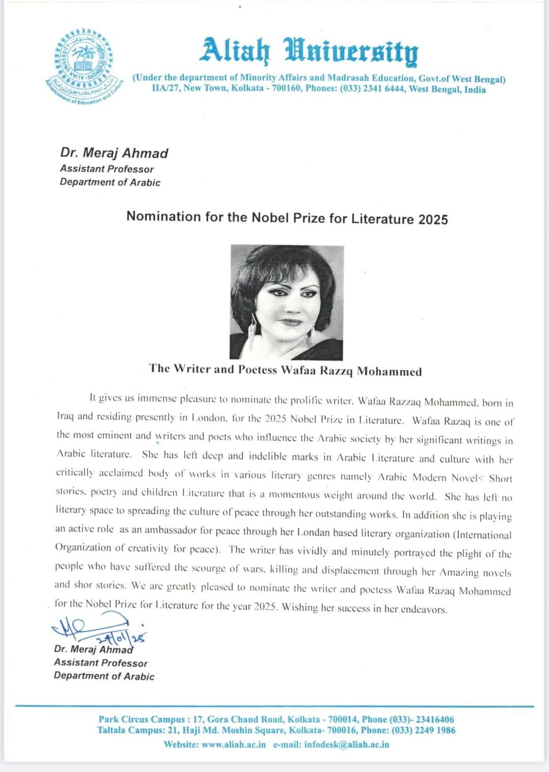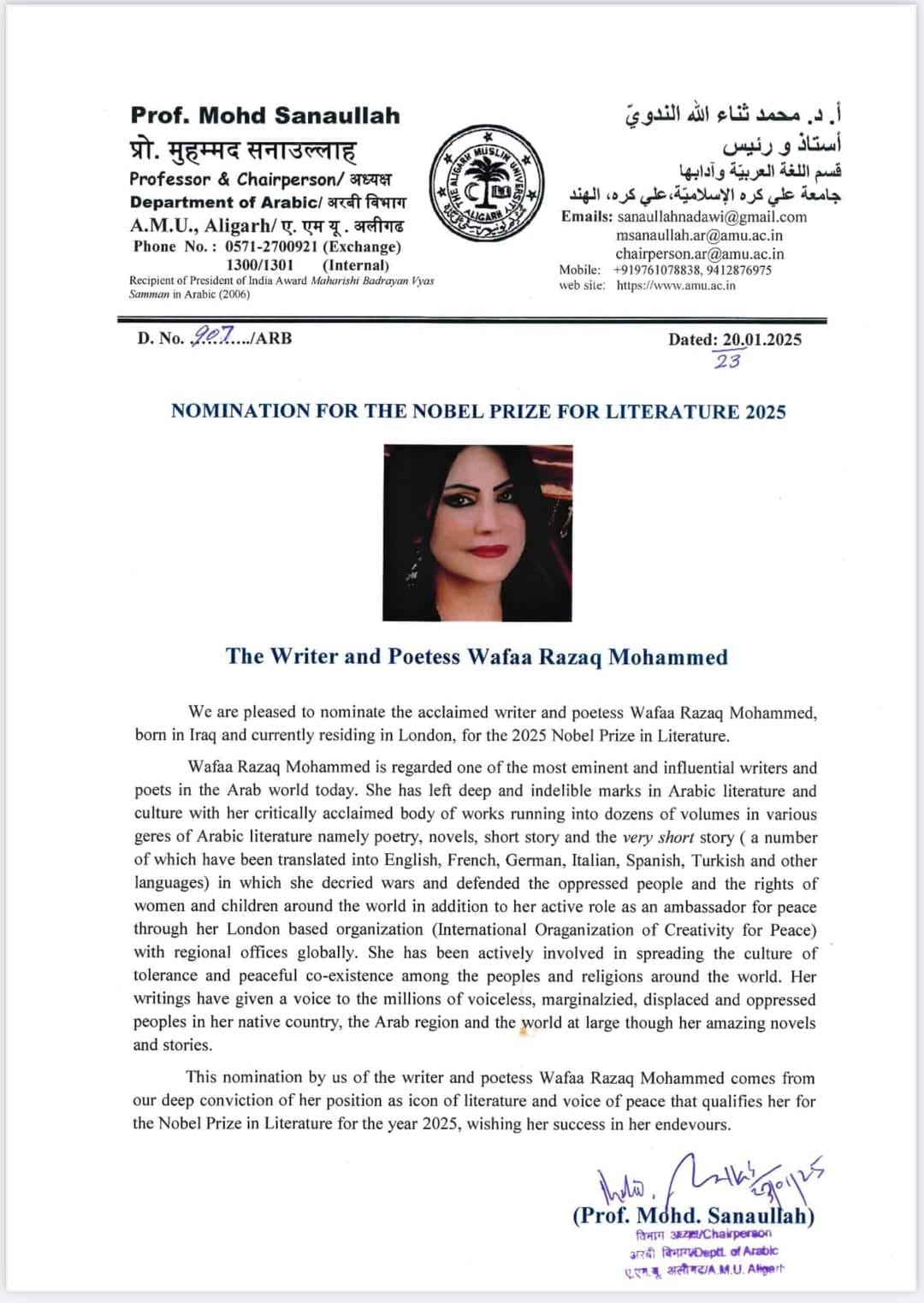 لذا،، يعجز شكري للعلَّامة سعادة البروفيسور"محمد ثناء الله الندوي" رئيس قسم اللغة العربية وآدابها( جامعة علي كره) الإسلامية ، علي كره، الهند. لترشيحي لجائزة نوبل للآداب لعام-٢٠٢٥.