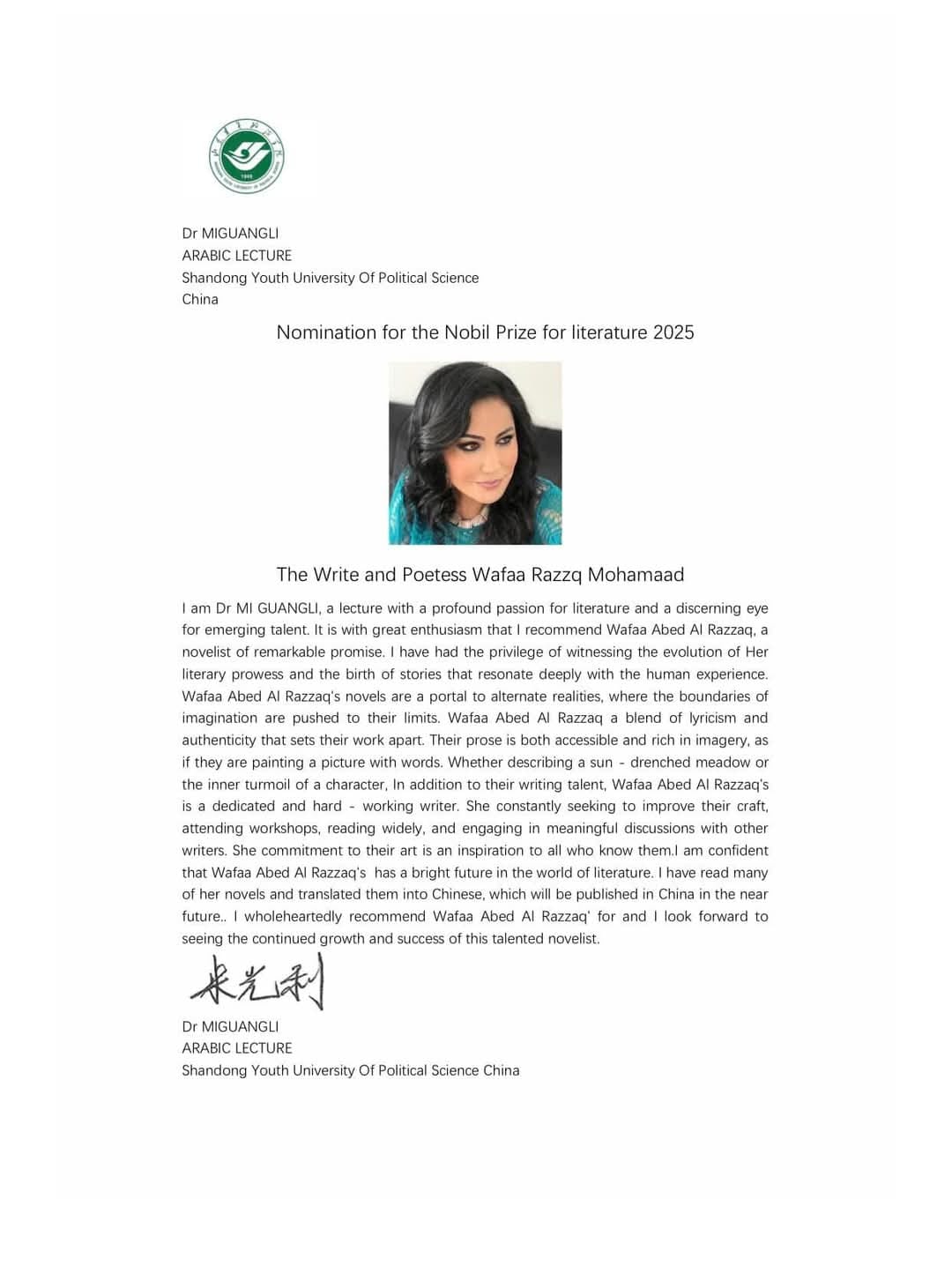 ٣-“Dr Miguangli “ أستاذ اللغة العربية وآدابها ( كلية الشباب) جامعة شنغهاي، الصين.
