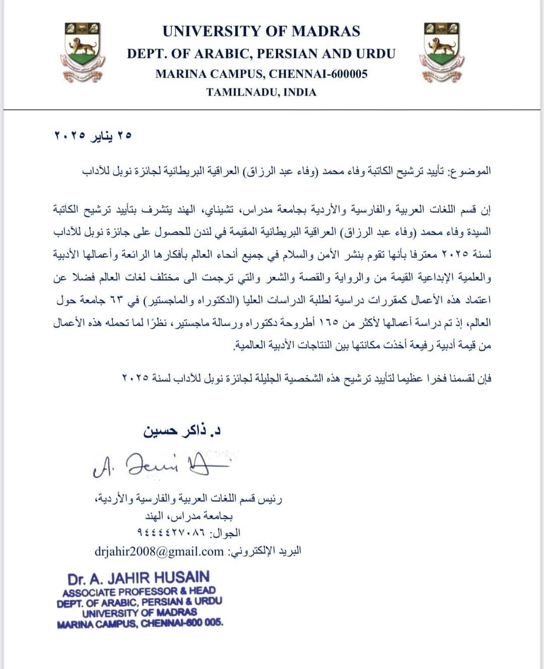 وقد تشرفت سابقا بترشيح سعادة البروفيسور" مجيب الرحمن" رئيس قسم اللغة العربية وآدابها ، جامعة ( جواهر لال نهرو) نيو دلهي، الهند.لعام -٢٠٢١.